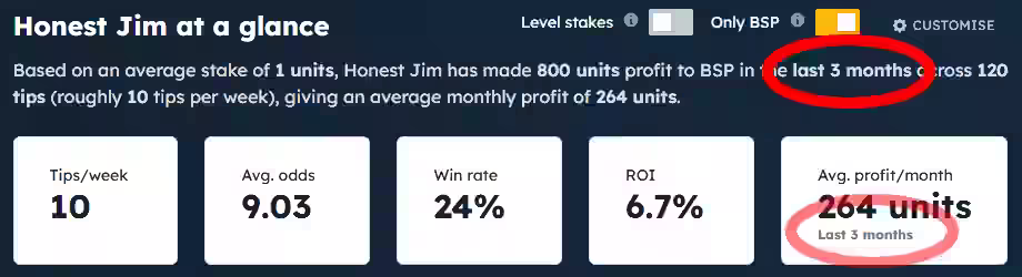 You just need to be wary when reading the “at a glance” figures. Especially for long-serving tipsters like Honest Jim who has been tipping on Tipstrr for over 5 years yet their average monthly profit is measured over 3 months ?!