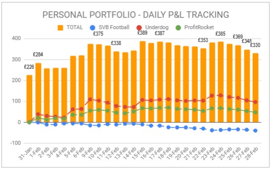 The early profits from Underdog and ProfitRocket never really progressed much from the £375 profit on Feb 10th. And the continuing SVB losses just drained those profits away.